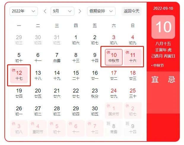 2022年中秋節(jié)放假時間2022年9月10日、11日、12日三天。